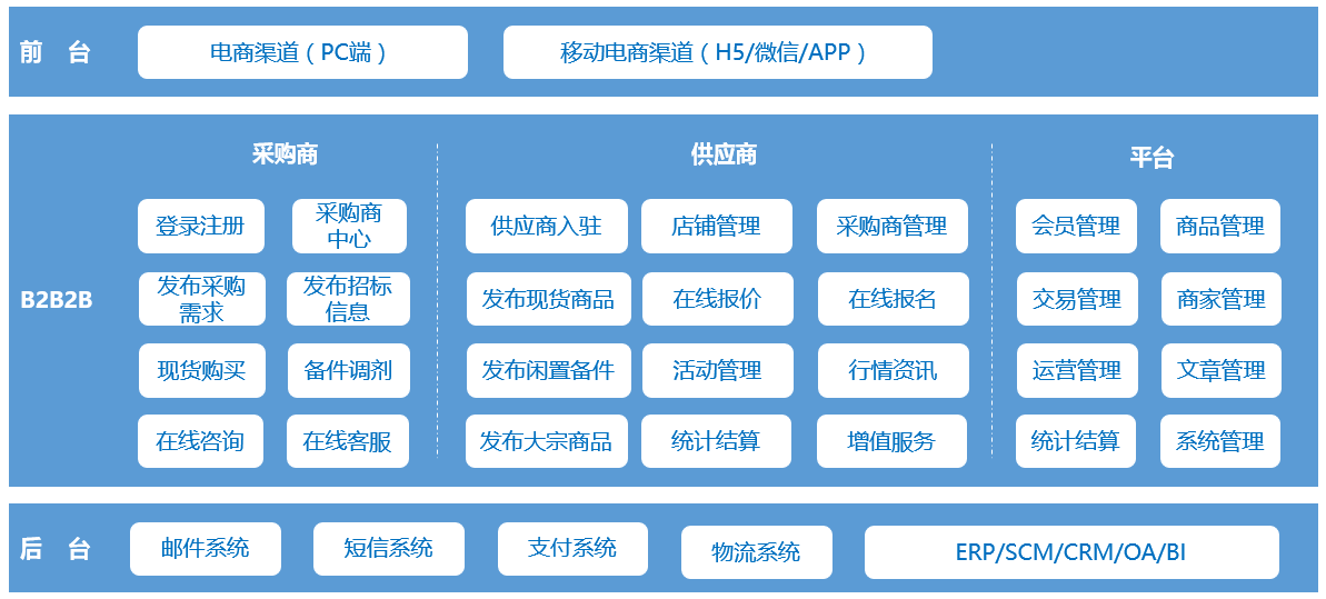 供应商发布供应商品,采购商在线购买、在线询价,供应商后台维护商品、管理订单,适合标品、小宗交易。
